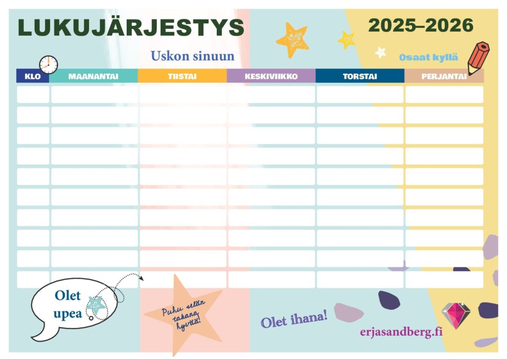 Tässä sinulle ilmaiseksi vahvuusperustaiset lukujärjestyspohjat alkavalle lukuvuodelle 2025-2026. Kaksi erilaista versiota, molemmat työjärjestykset suomeksi. Meillä on tärkeä tehtävä rakentaa jokaista lasta ja nuorta vahvemmaksi – omaa työhyvinvointia unohtamatta. Klikkaa sivun alaosasta Lataa-painikkeesta niin valitsemasi lukujärjestyspohja latautuu laitteellesi. Voit jakaa pohjat myös ryhmällesi. Lukujärjestys 1 2025-2026 Lataa Lukujärjestys 2 2025-2026 Lataa