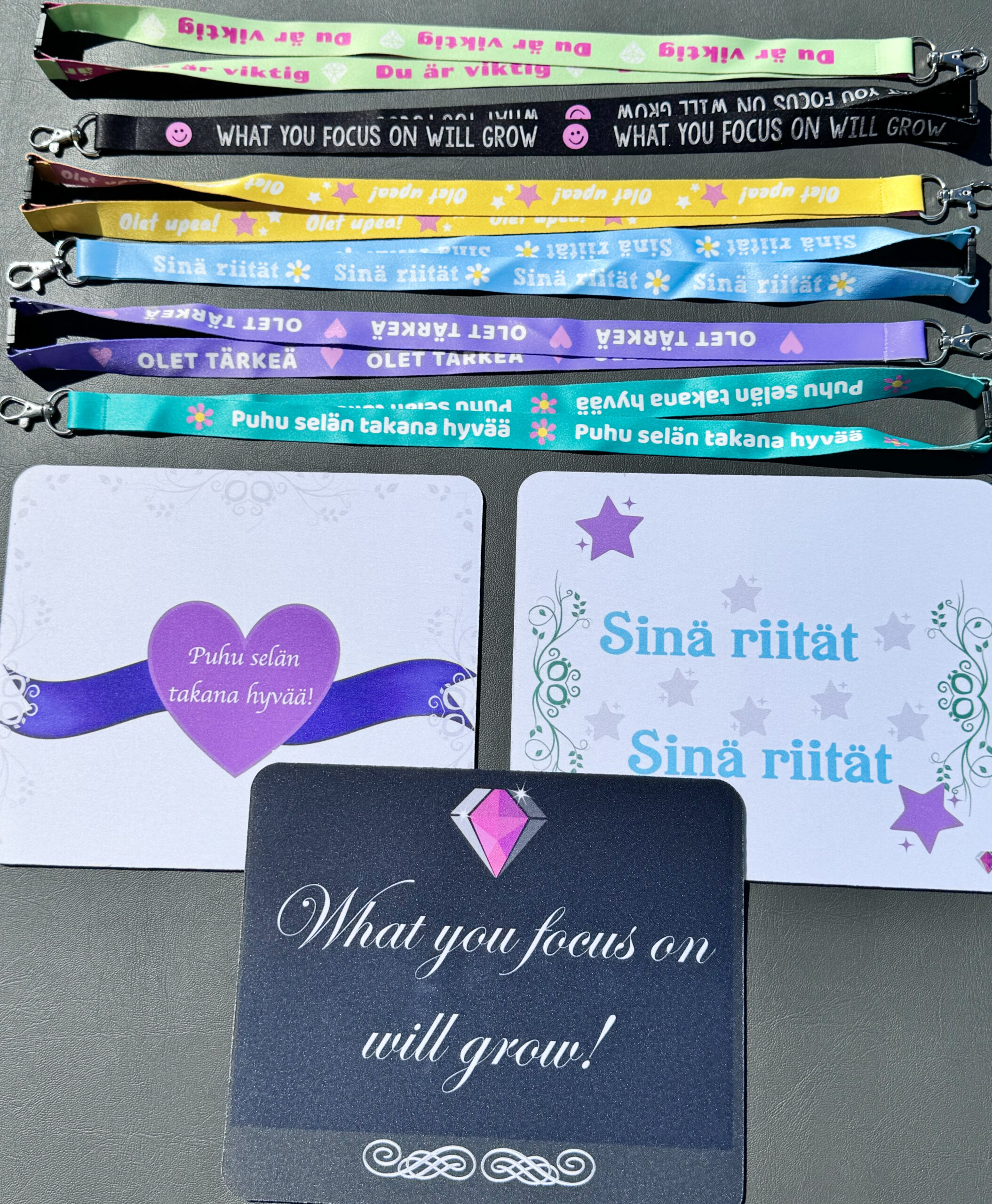 1. Upea kaulanauha valitsemallasi tekstillä. Tähän saat avaimet, kulkukortin, kuvakortit tms.