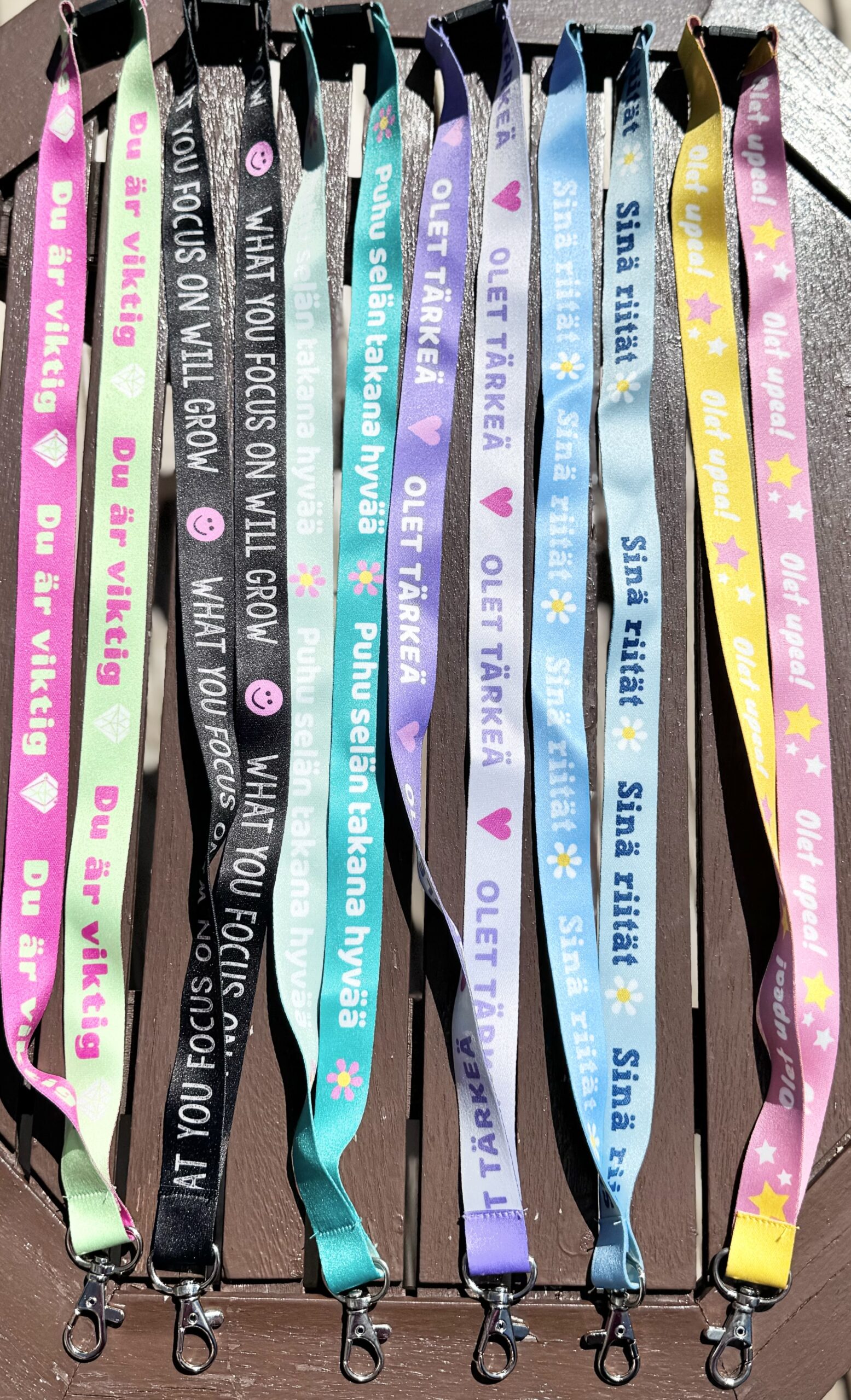 Upeat kaulanauhat valitsemillasi teksteillä. Avaimiin, kuvakortteihin, ID-korttiin ym.