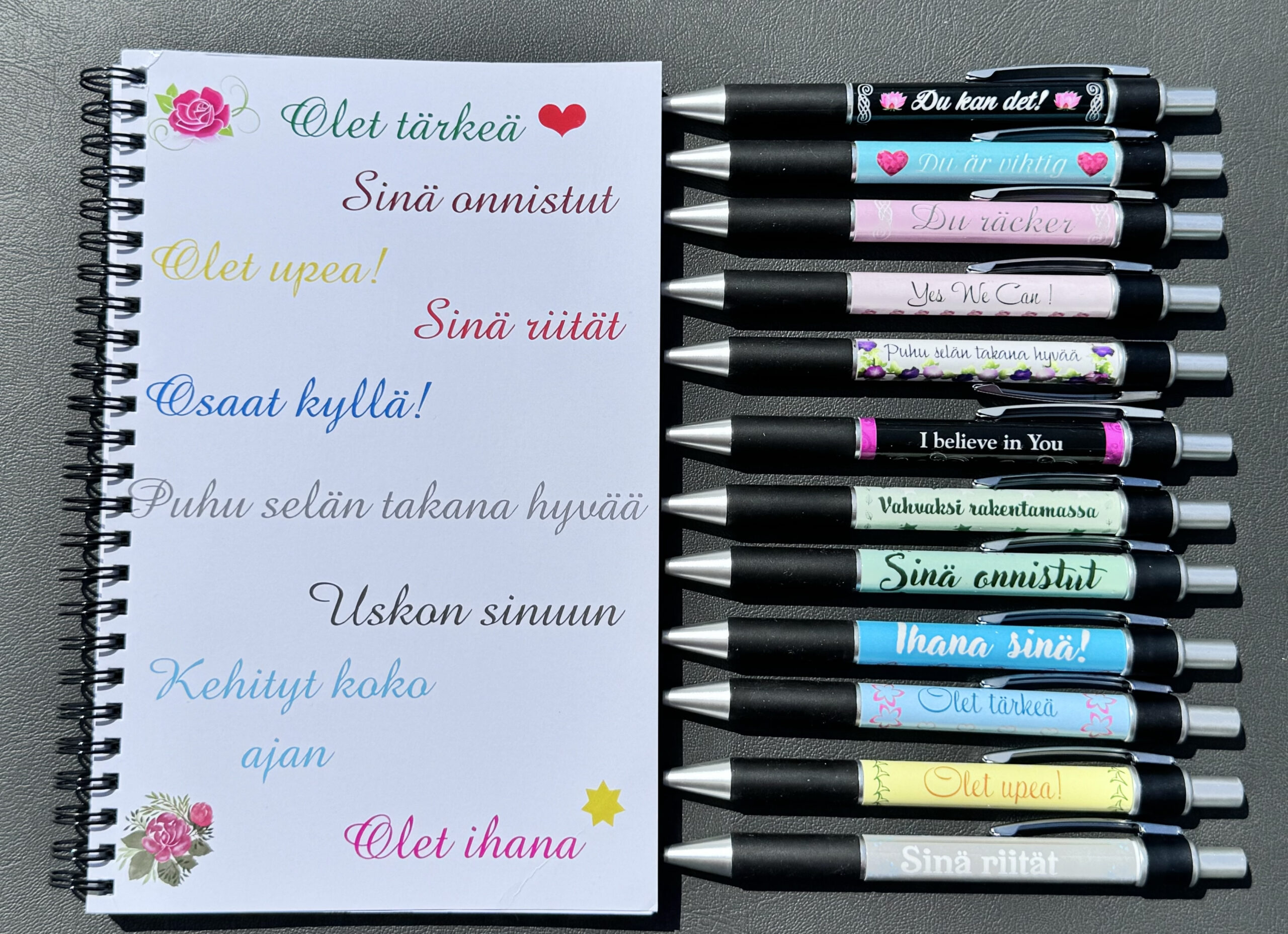 Tilaus sisältää valitsemasi 1 kpl kuulakärkikynän vahvuustekstillä (musteen väri on kaikissa musta) JA 1 kpl A5-kokoisen muistivihkon upeilla teksteiillä. Vihossa on kierreselkä ja 80 viivoitettua valkoista sivua.